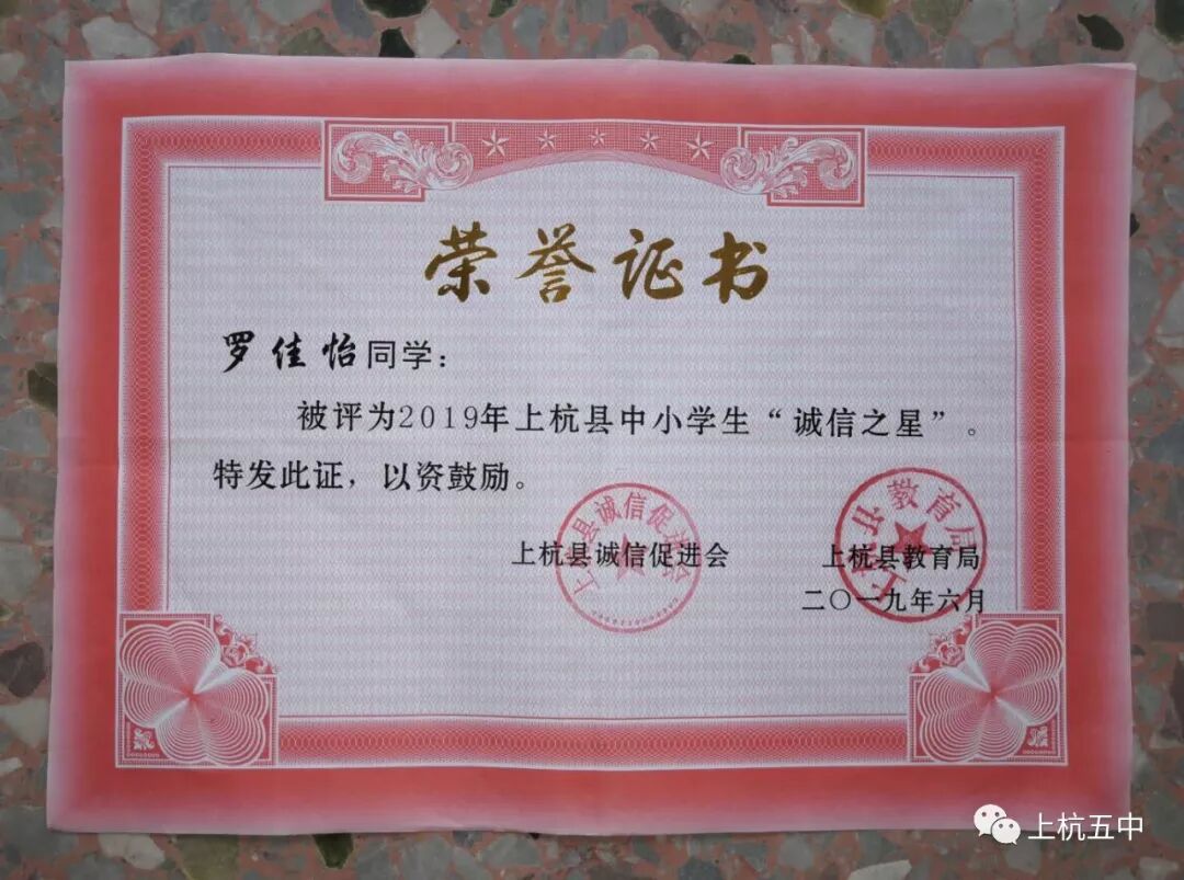 2019年6月上杭县中小学生诚信之星评选活动落幕,我校罗佳怡同学(高二(3),班主任:江锐)荣获,县“诚信之星”荣誉称号。